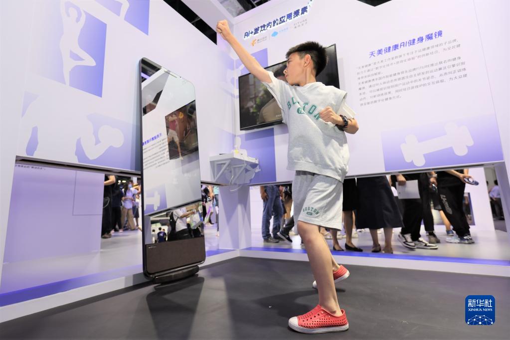 7月6日,一名兒童在騰訊展位天美健康AI健身魔鏡前運動(dòng)。