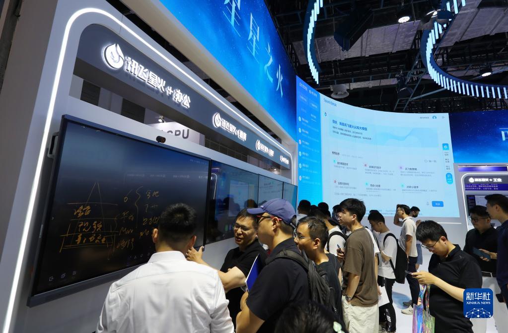 7月6日,參觀(guān)者在2023世界人工智能大會(huì )展會(huì )現場(chǎng)的訊飛星火認知大模型展示屏前交流。