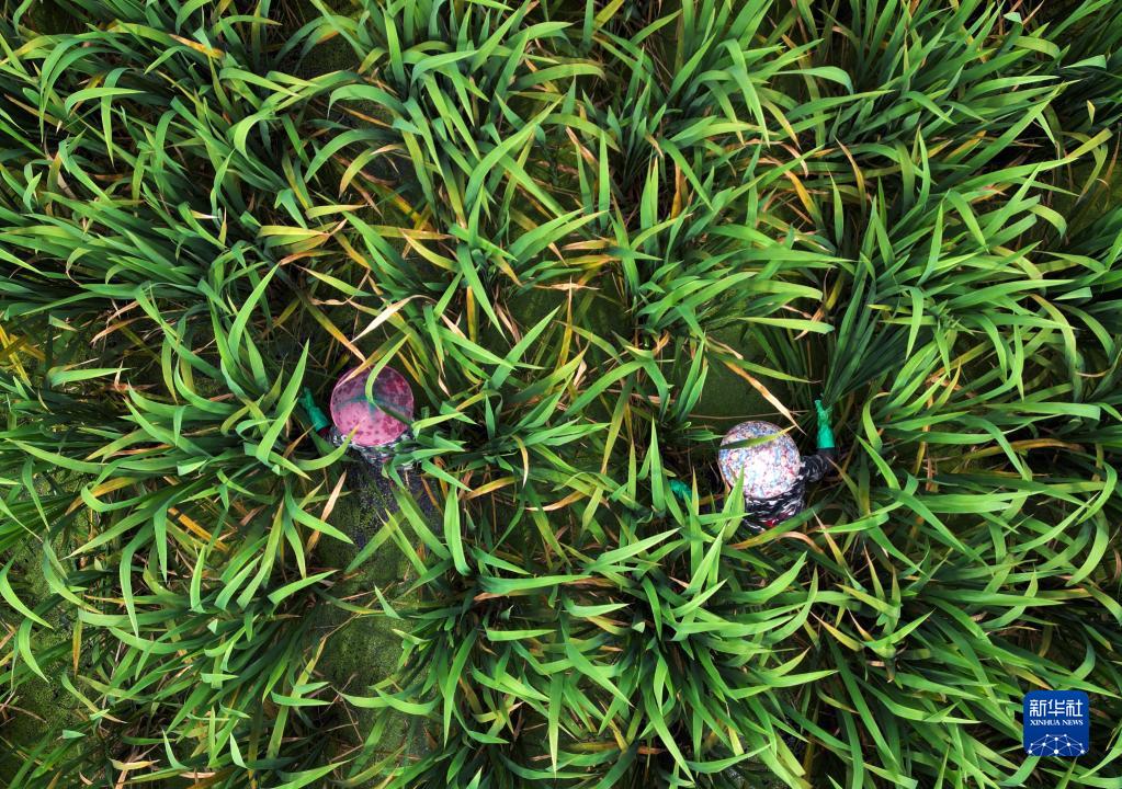 7月6日,蘆潼村的村民在采收茭白(無(wú)人機照片)。