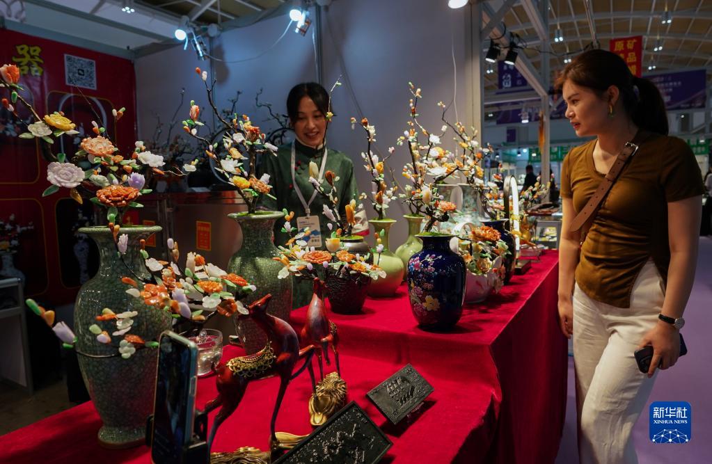 7月6日,一名參觀(guān)者(右)在石博會(huì )上觀(guān)看由玉石制作的插花。