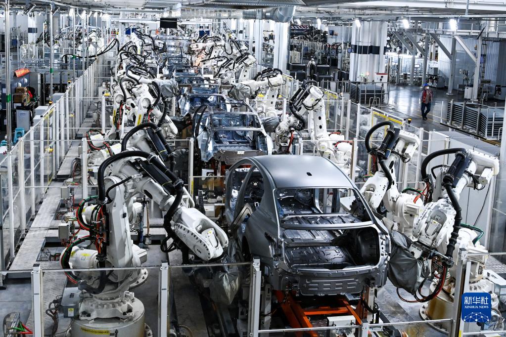 在位于吉林省長(cháng)春市的一汽紅旗繁榮工廠(chǎng)焊裝車(chē)間內,焊裝機器人在生產(chǎn)線(xiàn)上焊接車(chē)身(2022年10月17日攝)。