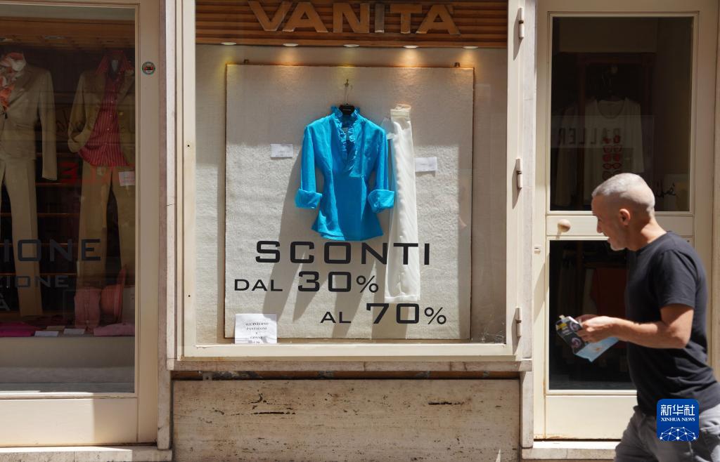 7月6日,一名男子經(jīng)過(guò)意大利羅馬一處店鋪的夏季打折廣告牌。
