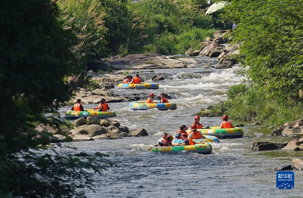 江西南昌連日高溫,人們來(lái)到郊外峽谷山澗,體驗漂流旅游項目,親近自然山水,享受夏日清涼。
