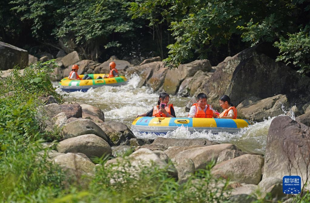 江西南昌連日高溫,人們來(lái)到郊外峽谷山澗,體驗漂流旅游項目,親近自然山水,享受夏日清涼。