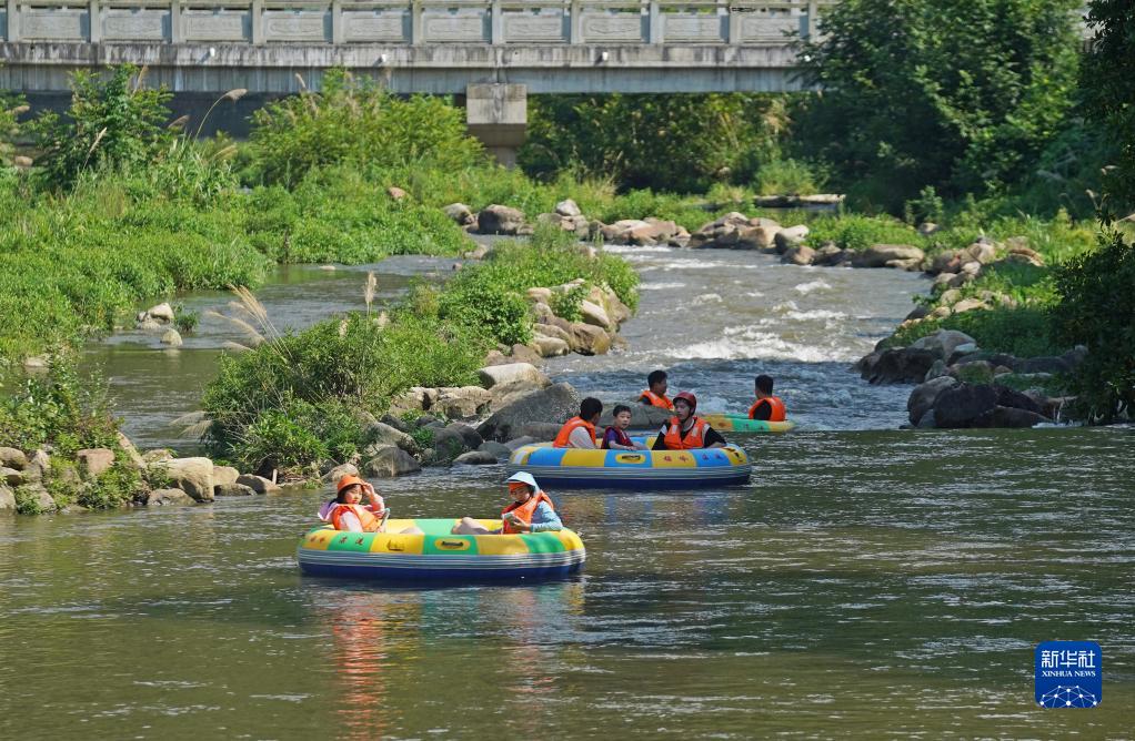江西南昌連日高溫,人們來(lái)到郊外峽谷山澗,體驗漂流旅游項目,親近自然山水,享受夏日清涼。