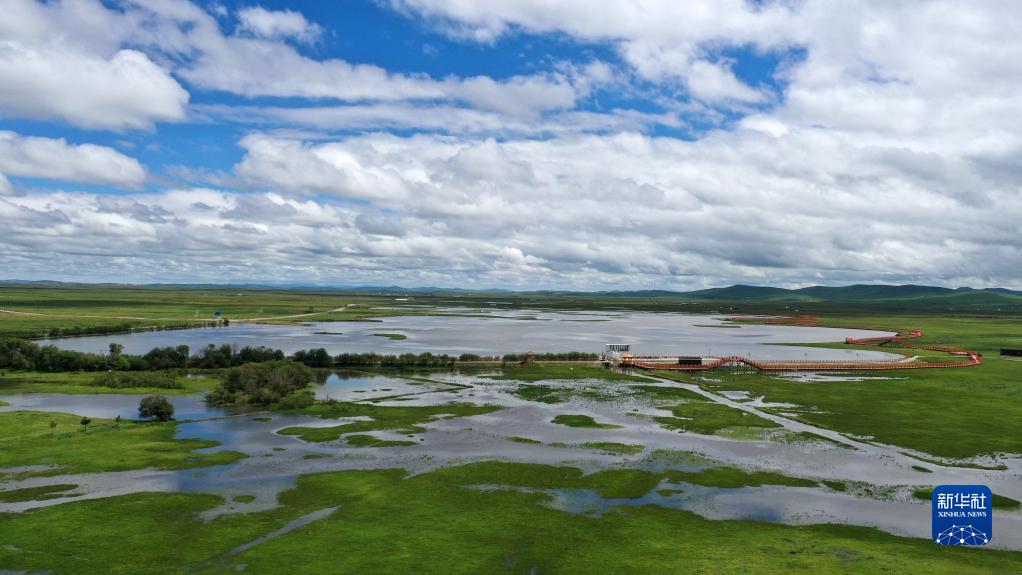 這是瑪曲縣河曲馬場(chǎng)的濕地草原景色(7月5日攝,無(wú)人機照片)。