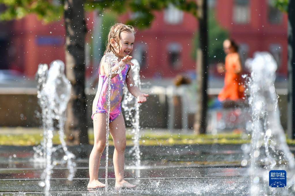7月6日,在俄羅斯首都莫斯科,兒童在噴泉中玩耍消暑。