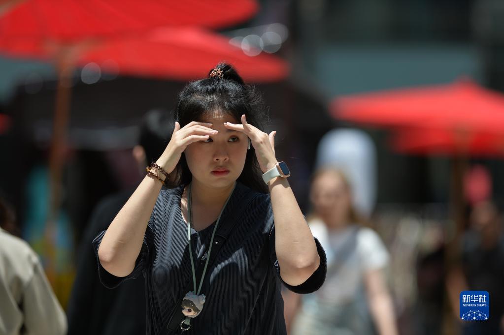 7月7日,行人在泰國曼谷街頭用手遮陽(yáng)。