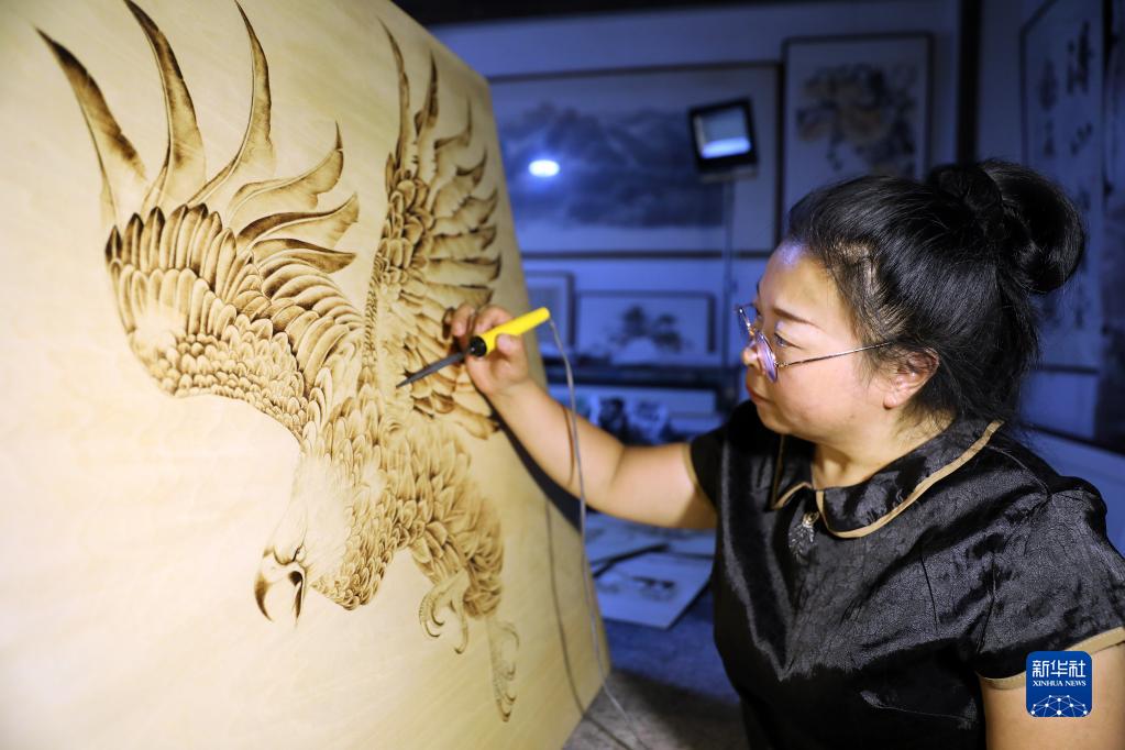 7月6日,李影在位于遼寧省營(yíng)口市大石橋的工作室里進(jìn)行木板烙畫(huà)創(chuàng )作。