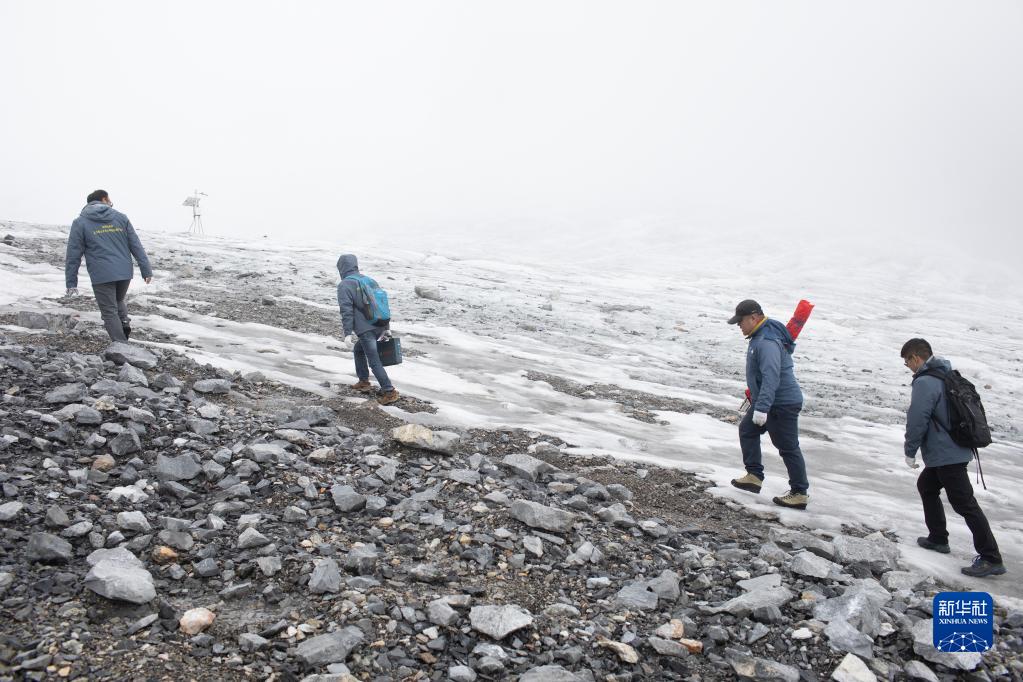 玉龍雪山站站長(cháng)王世金(左一)帶領(lǐng)團隊成員攜帶監測設備在白水河1號冰川上前行(6月19日攝)。