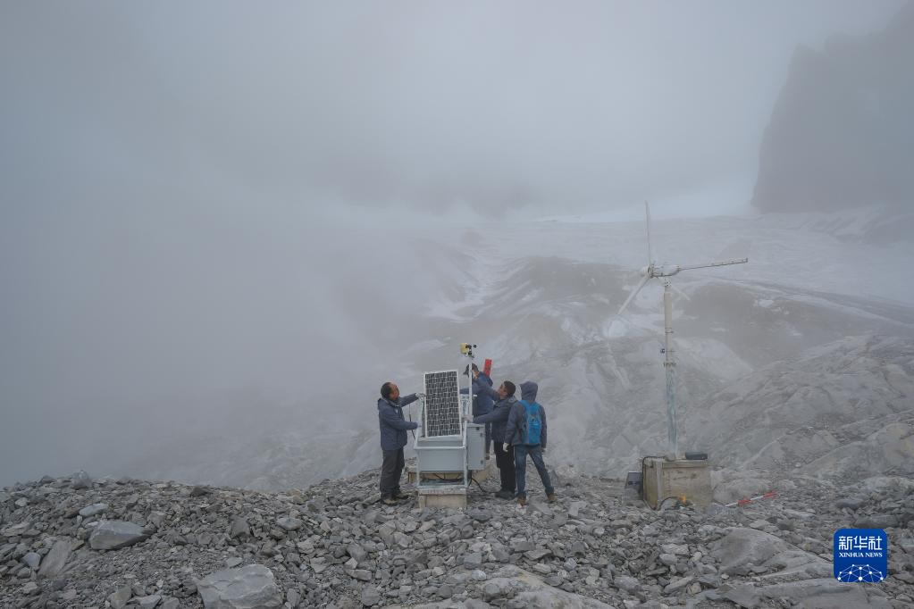 玉龍雪山站站長(cháng)王世金(左一)和團隊成員在玉龍雪山上一處氣象觀(guān)測站點(diǎn)查看設備(6月19日攝)。