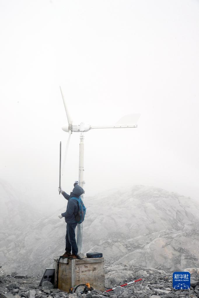玉龍雪山站工作人員杜春紅在玉龍雪山上一處氣象觀(guān)測站點(diǎn)檢查設備(6月19日攝)。