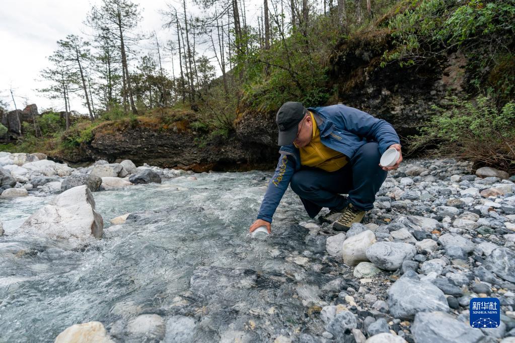 玉龍雪山站工作人員燕興國在白水河水文觀(guān)測點(diǎn)取水樣(6月16日攝)。