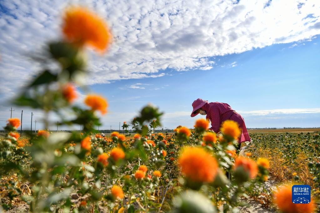7月7日,采摘工人在新疆裕民縣江格斯鄉江格斯南村采收紅花絲。
