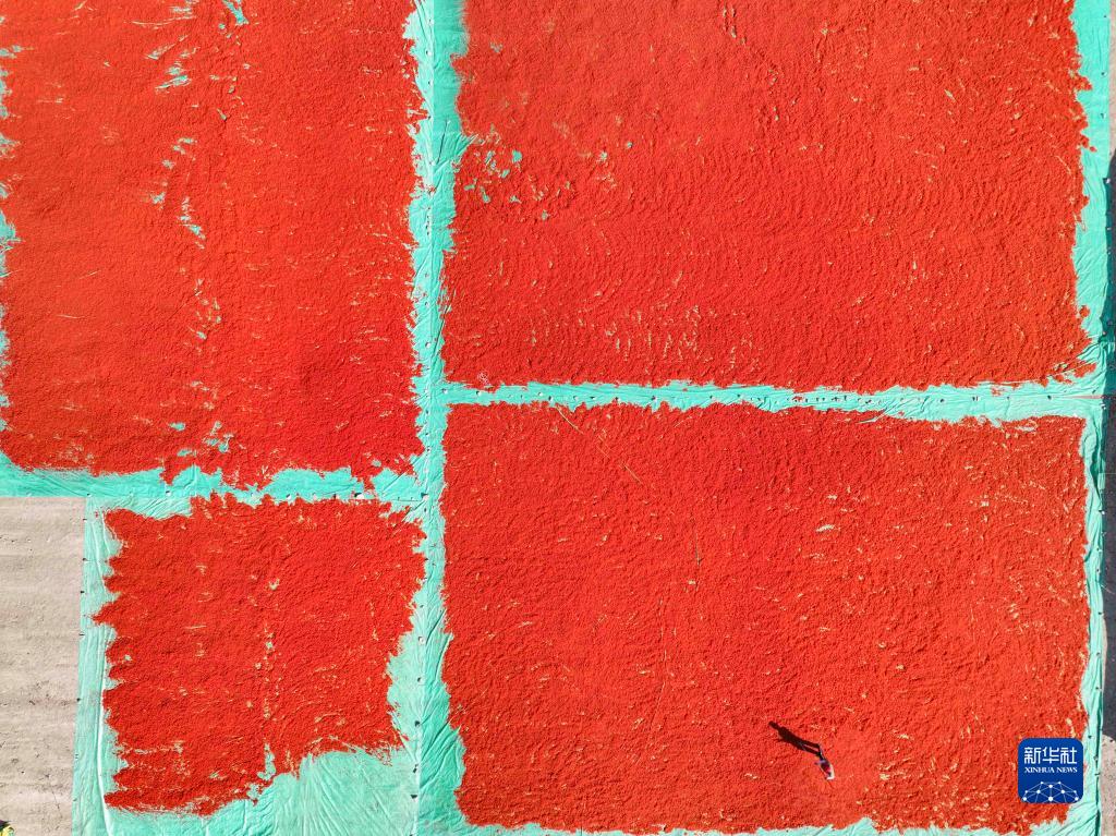 7月7日,新疆裕民縣江格斯鄉的村民在晾曬紅花絲(無(wú)人機照片)。