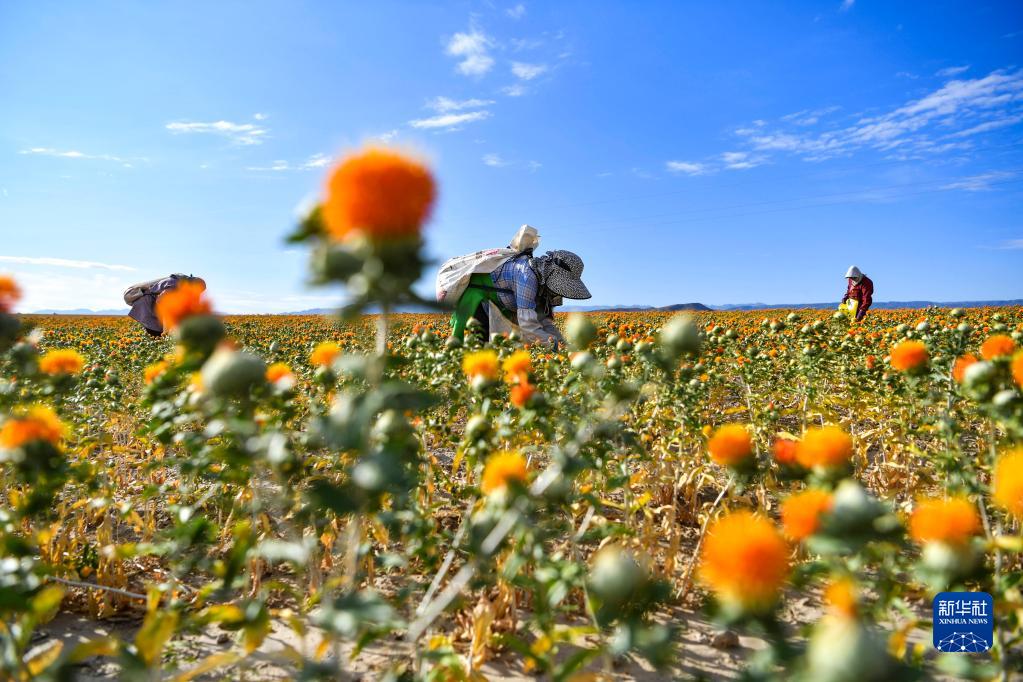 7月7日,采摘工人在新疆裕民縣江格斯鄉江格斯南村采收紅花絲。