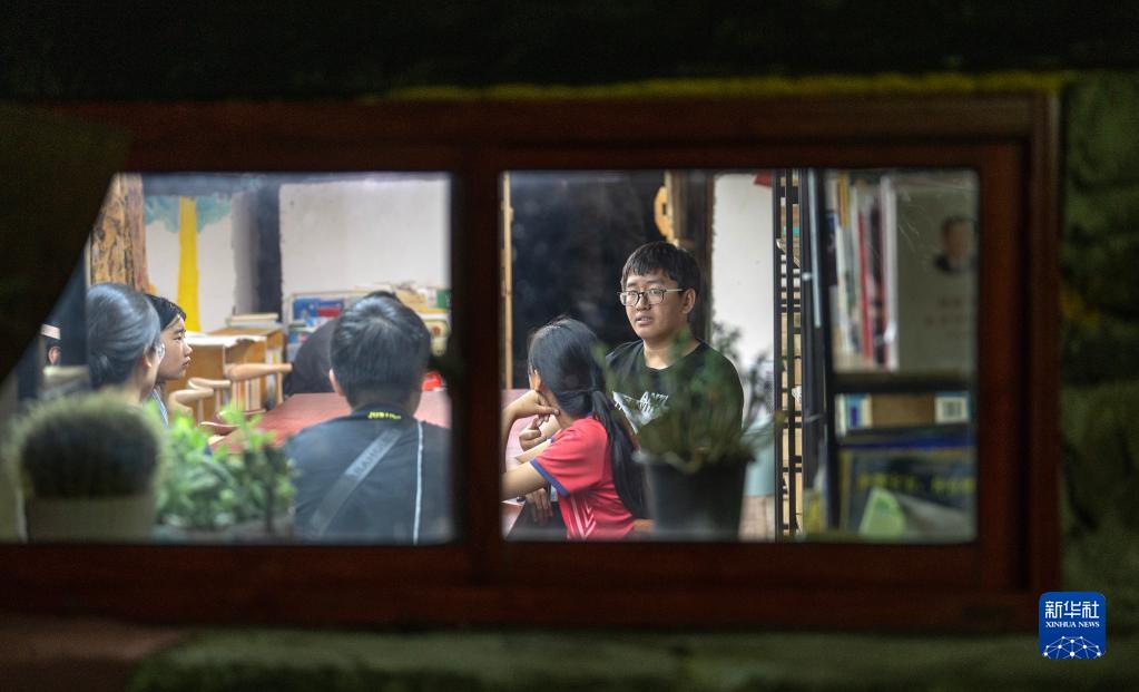 7月5日晚,甘文勇(右一)在“半山花語(yǔ)”書(shū)屋組織讀書(shū)活動(dòng)。新華社記者 費茂華 攝