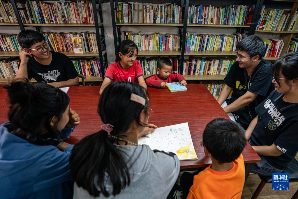 7月5日,甘文勇(左上)在“半山花語(yǔ)”書(shū)屋與孩子們一起參加讀書(shū)活動(dòng)。新華社記者 江文耀 攝