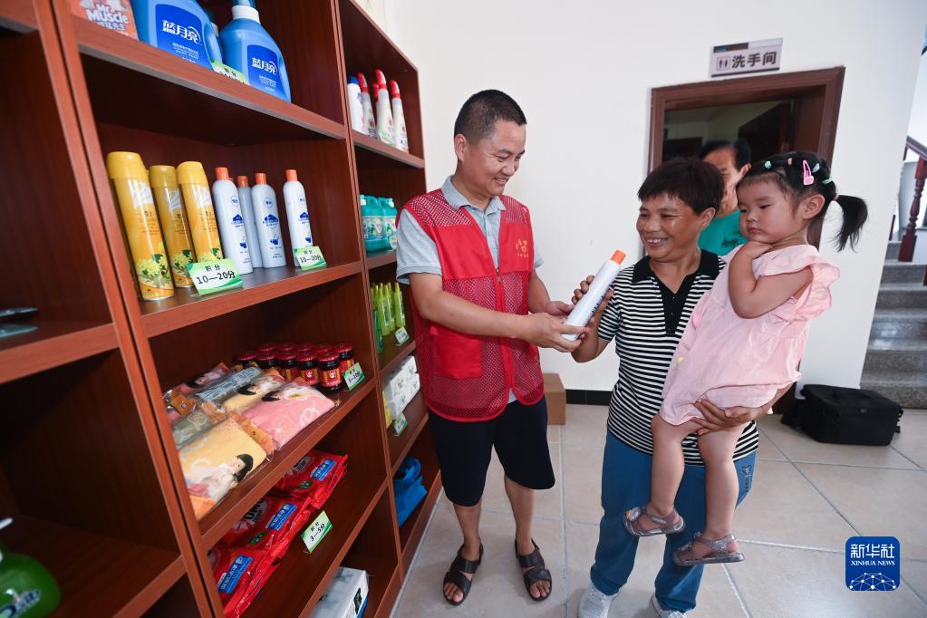 7月7日,在杭州市臨安區清涼峰鎮頰口村文化禮堂的“家風(fēng)銀行”積分超市,黨員志愿者在給村民兌換禮品。
