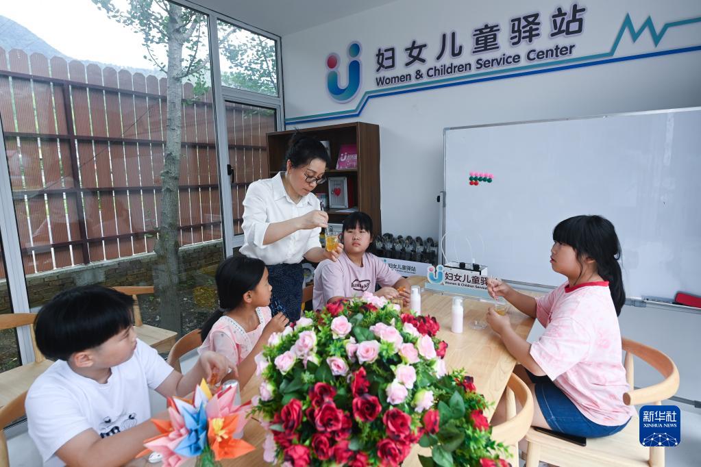 7月7日,在杭州市臨安區清涼峰鎮新峰村婦女兒童驛站,新鄉賢陳雨霞給當地兒童上暑期公益課程,教孩子們制作天然香皂。