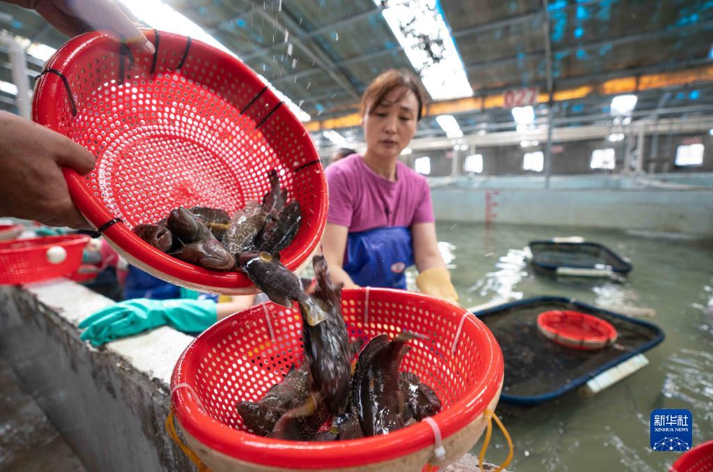 7月7日,在滄州渤海新區黃驊市一家水產(chǎn)養殖開(kāi)發(fā)股份有限公司養殖車(chē)間,工人在分揀石斑魚(yú)。