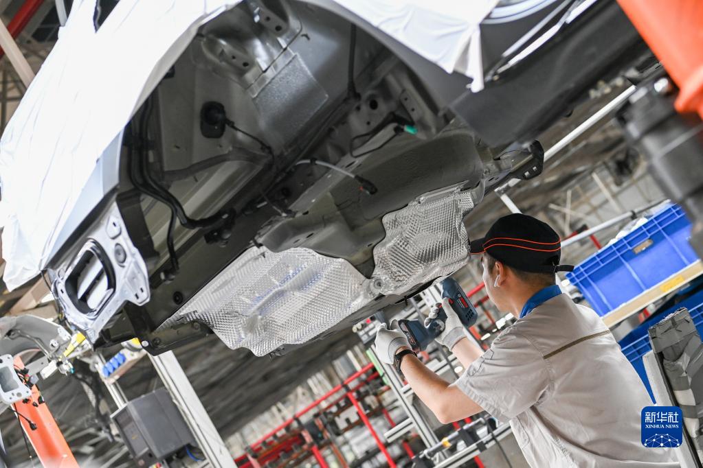 在位于吉林長(cháng)春的一汽-大眾長(cháng)春生產(chǎn)整車(chē)制造一部總裝一車(chē)間,工人在生產(chǎn)線(xiàn)上裝配車(chē)輛(6月12日攝)。