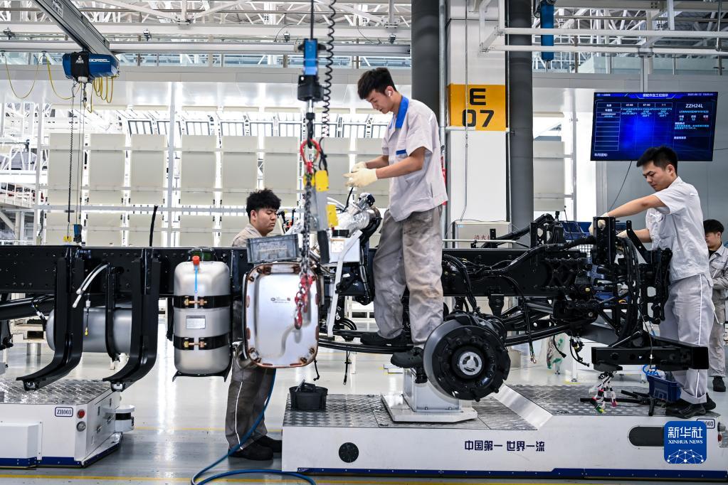 在位于吉林長(cháng)春的一汽解放J7智能工廠(chǎng)內,工人在生產(chǎn)線(xiàn)上裝配車(chē)輛(6月12日攝)。