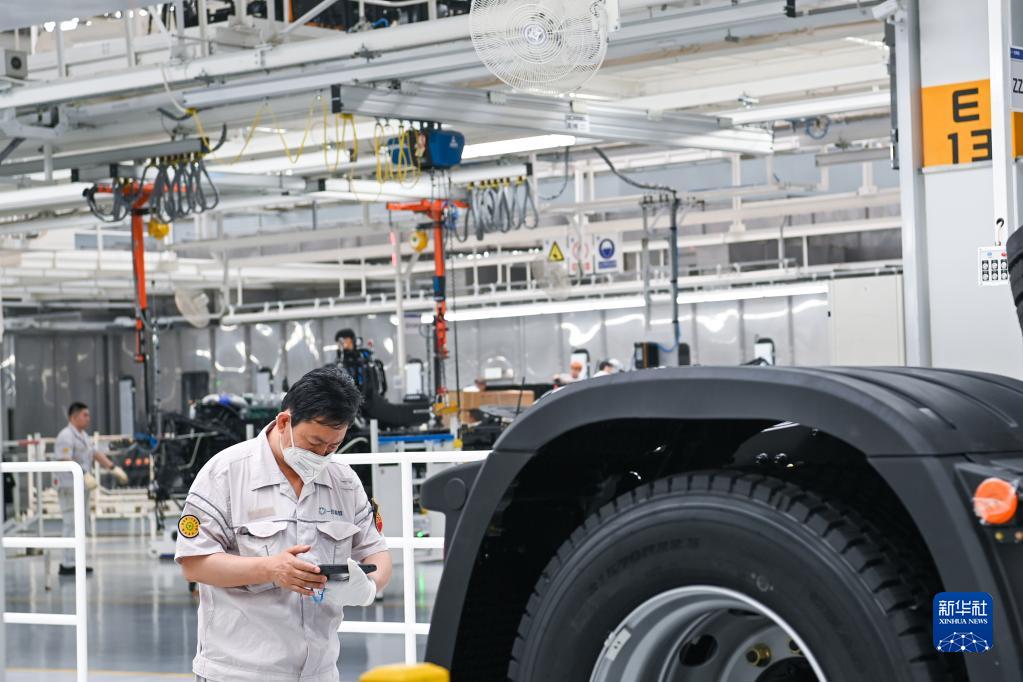 在位于吉林長(cháng)春的一汽解放J7智能工廠(chǎng)內,工人用智能化設備調度車(chē)輛裝配情況(6月12日攝)。