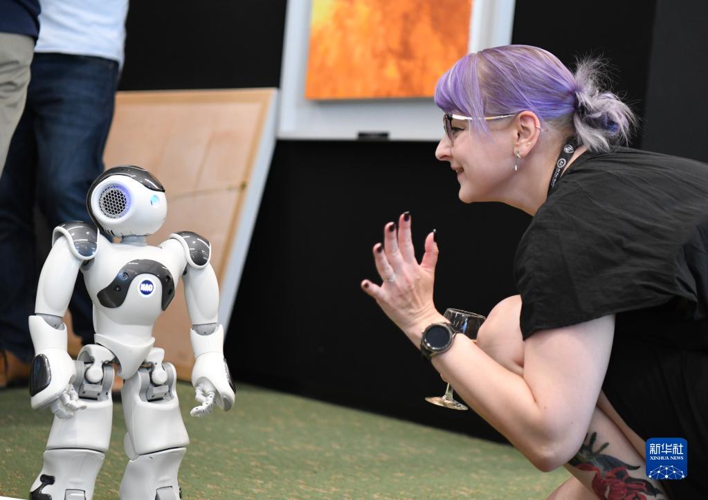 7月7日,在瑞士日內瓦“人工智能造福人類(lèi)全球峰會(huì )”上,一名參會(huì )者與機器人互動(dòng)。