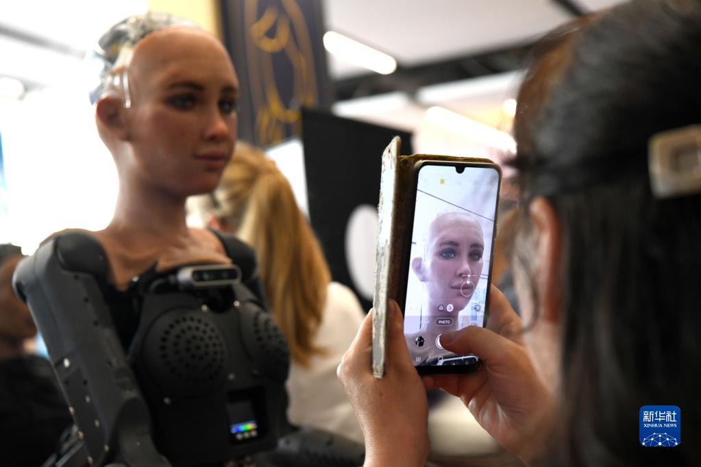 7月7日,在瑞士日內瓦“人工智能造福人類(lèi)全球峰會(huì )”上,一名參會(huì )者給仿真機器人索菲亞拍照。