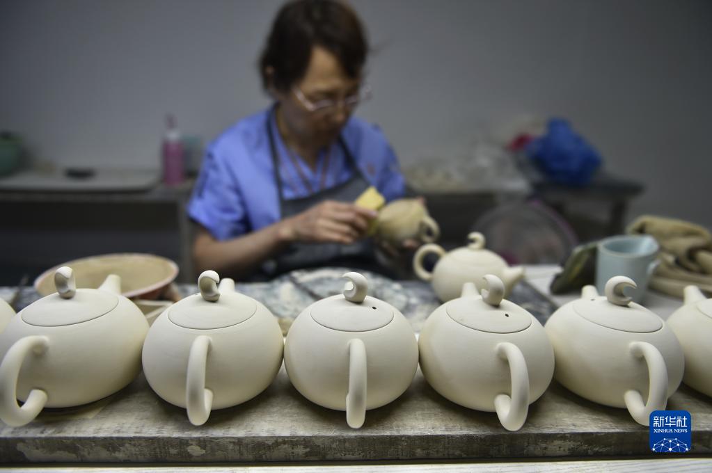 7月6日,工作人員在河南省汝州市玉松汝瓷有限公司的車(chē)間里加工汝瓷產(chǎn)品。