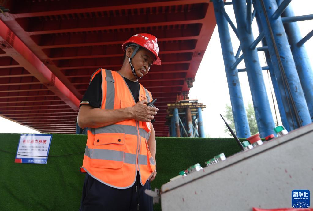 7月8日,中鐵二十局施工人員在鋼桁梁頂推作業(yè)現場(chǎng)監控數據。