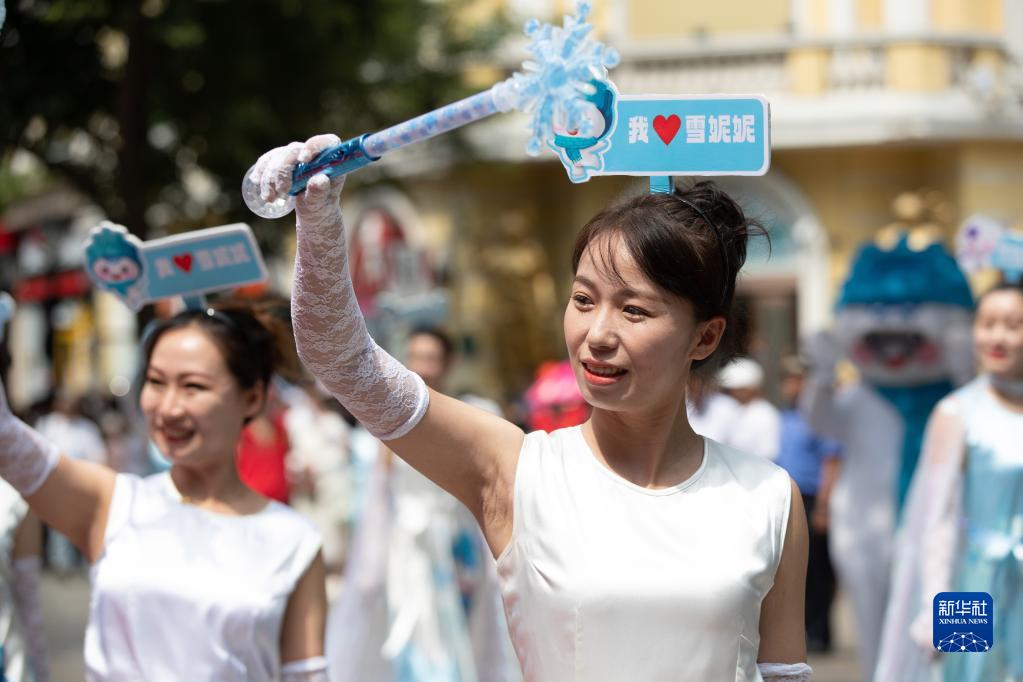 7月8日,在哈爾濱市中央大街上,人們參加巡游慶祝。