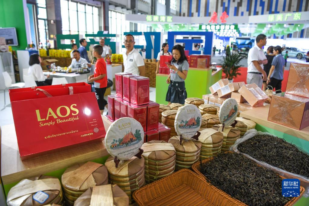 這是在2023年生態(tài)文明貴陽(yáng)國際論壇綠色創(chuàng )新產(chǎn)品展上展出的老撾茶(7月8日攝)。