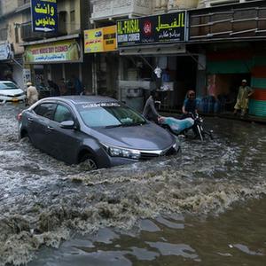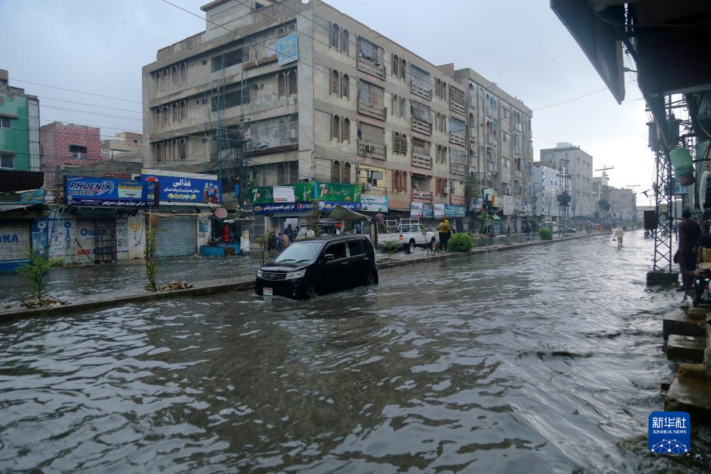 7月7日,車(chē)輛在巴基斯坦海得拉巴積水的道路上行進(jìn)。
