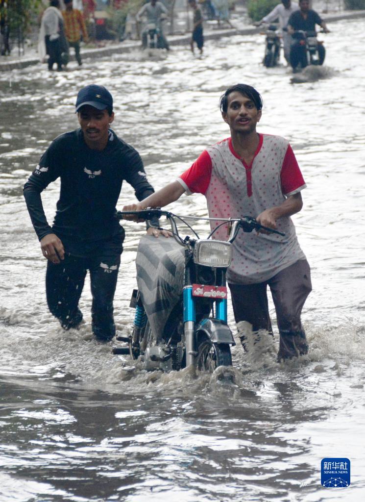 7月7日,人們在巴基斯坦海得拉巴積水的道路上行進(jìn)。