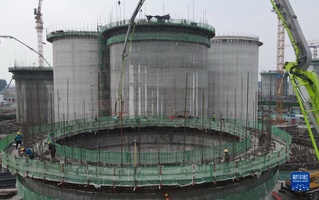 7月8日,工人在糧食安全應急儲備及食品深加工全鏈化綜合生產(chǎn)基地項目建設工地施工(無(wú)人機照片)。
