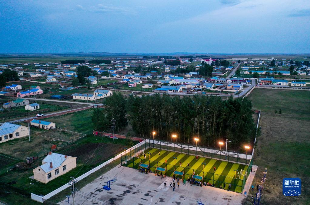 6月26日,牧民們在錫尼河鎮的五人制球場(chǎng)里踢球(無(wú)人機照片)。