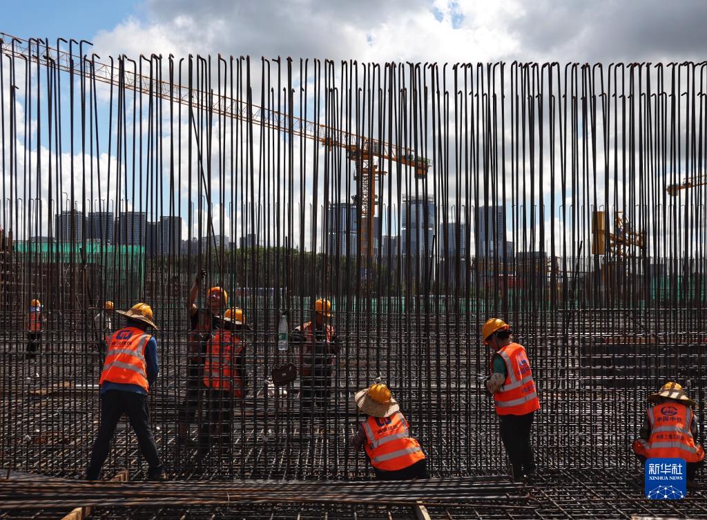 7月9日,中鐵上海局施工人員在南山水廠(chǎng)建設現場(chǎng)綁扎鋼筋。