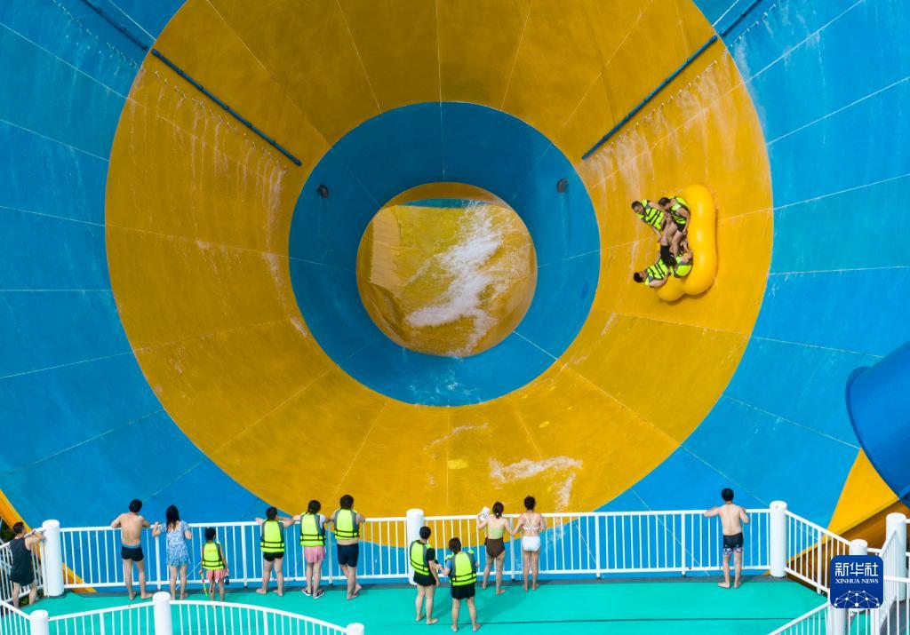 7月8日,游客在安徽省蕪湖市南陵縣大浦鄉村世界的水上樂(lè )園戲水游玩。