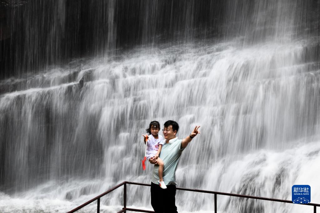 7月9日,游客在新密市伏羲山大峽谷內游玩。