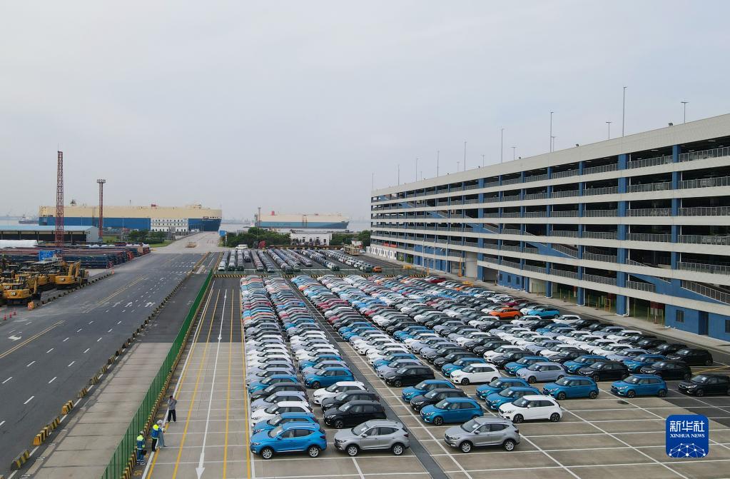上海外高橋海通汽車(chē)碼頭等待裝船運往澳大利亞的上汽MG品牌汽車(chē)(7月9日攝,無(wú)人機照片)。