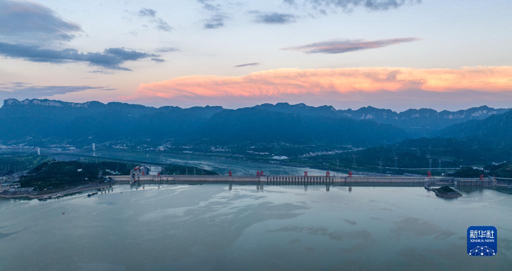 這是7月9日在湖北省宜昌市拍攝的夕陽(yáng)映照下的三峽水利樞紐工程(無(wú)人機照片)。