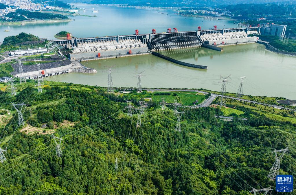 7月10日在湖北省宜昌市拍攝的長(cháng)江三峽水利樞紐工程和右岸外送輸電線(xiàn)路(無(wú)人機照片)。