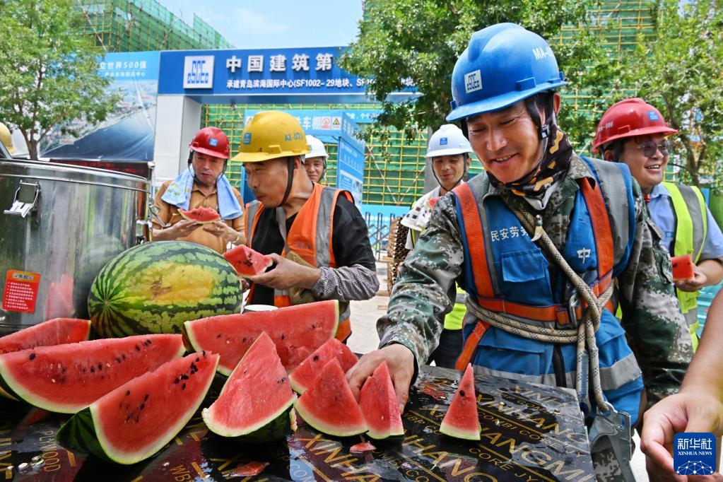 7月10日,中建二局青島濱海國際中心項目部的工人在休息站領(lǐng)取防暑降溫食品。
