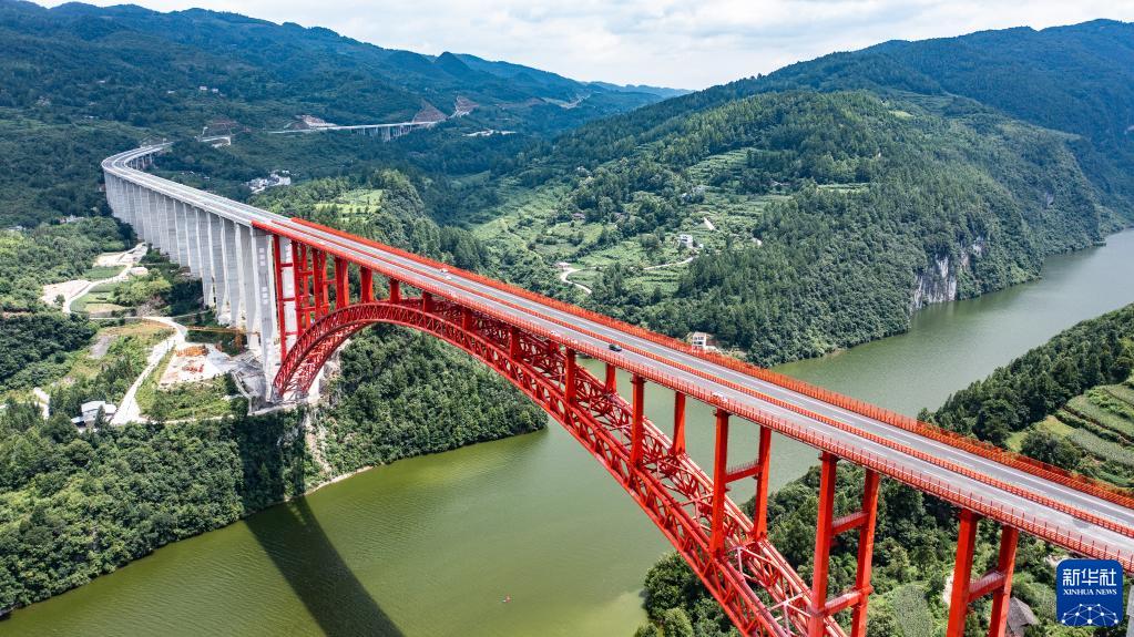 車(chē)輛行駛通過(guò)德余高速公路烏江特大橋(7月10日攝,無(wú)人機照片)。