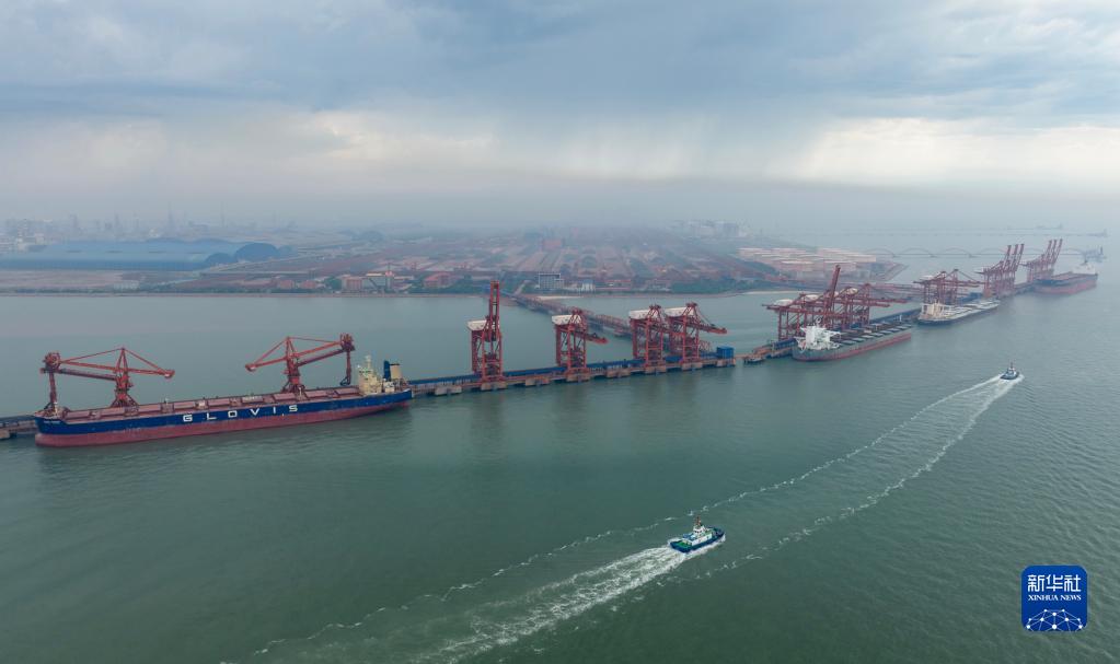 7月10日,多艘輪船靠泊在唐山港曹妃甸港區礦石碼頭卸載(無(wú)人機照片)。