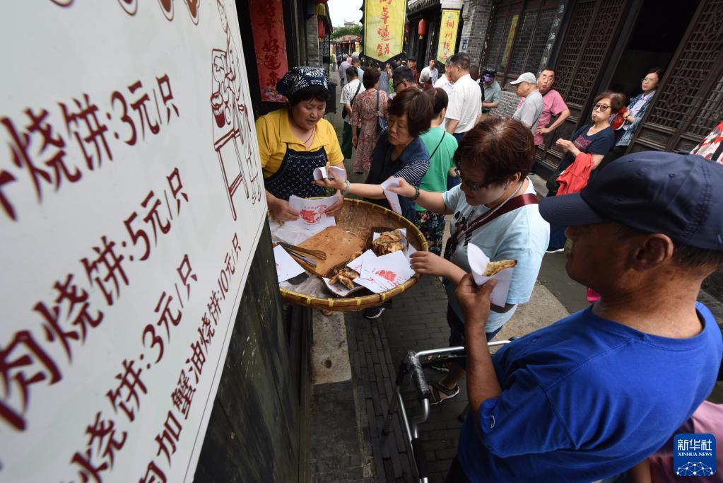 7月10日,游客在東臺安豐老街品嘗傳統特色燒餅。