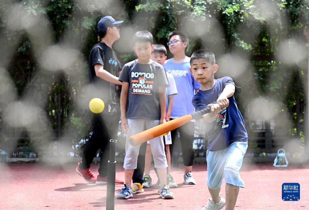 7月10日,學(xué)生在河北省石家莊市保利啟新小學(xué)暑期托管班練習軟式棒壘球。