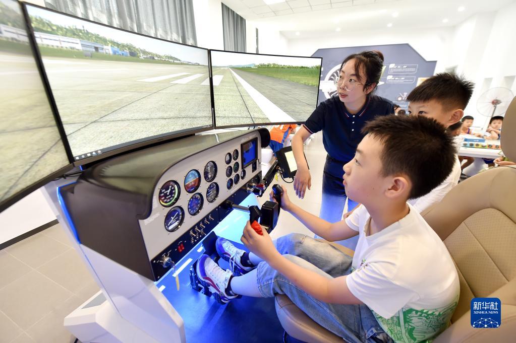 7月10日,在石家莊市融創(chuàng )中心第一小學(xué),學(xué)生在老師的指導下進(jìn)行飛行模擬駕駛。